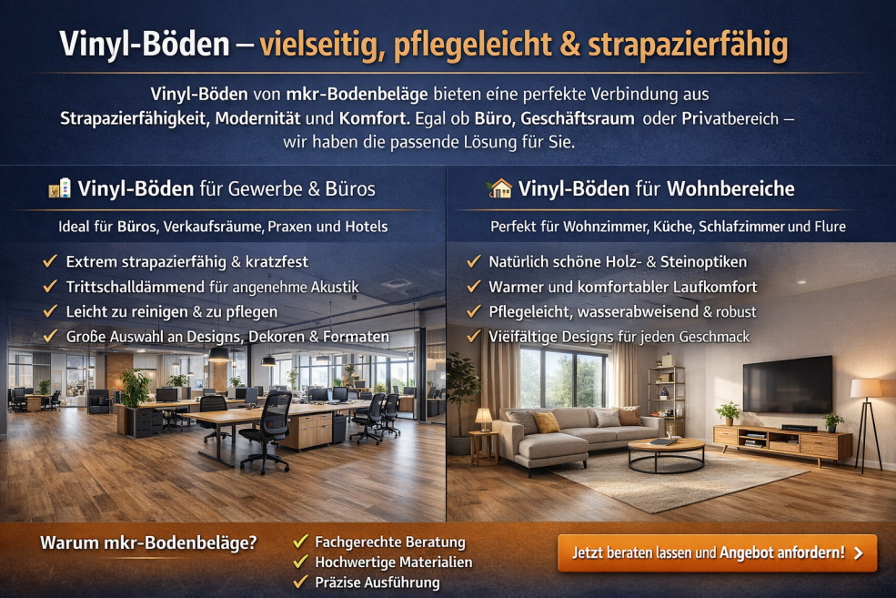 Vinylböden von mkr-Bodenbeläge vereinen modernes Design mit hoher Belastbarkeit und angenehmem Laufkomfort. Ob Industrie, Gewerbe oder Privatbereich – Vinyl ist die ideale Lösung für stark genutzte Flächen mit hohen optischen Ansprüchen.