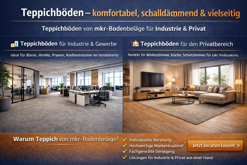 Teppichböden von mkr-Bodenbeläge sorgen für Komfort, Wärme und eine angenehme Raumakustik. Ob stark frequentierte Gewerbeflächen oder gemütliche Wohnräume – wir bieten hochwertige Teppichlösungen für Industrie und Privat.